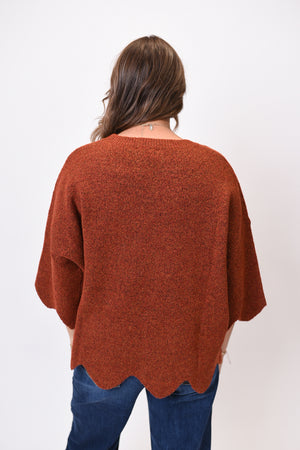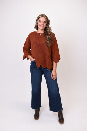 The Woven Whim Sweater brings cozy charm with a feminine twist. Crafted from a soft knit blend with beautiful scalloped hems, this relaxed pullover is made for effortless everyday style. Its boxy silhouette and drop shoulders keep it casual yet refined—ideal for pairing with your favorite denim or trousers all season long.